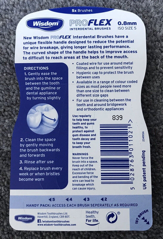 WISDOM PROFLEX SIZE 5 0.8mm Green Interdental Brushes 5 Per Pack X 2 Packs