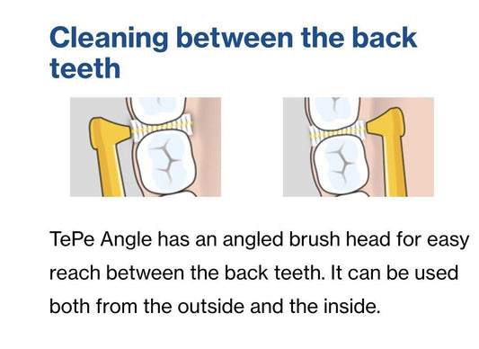 TePe Angle™ is designed to clean the gaps between the teeth, where a regular toothbrush is unable to reach. This interdental brush has a long handle and an angled head for easier access between the back teeth. Use daily to keep gums and teeth healthy and fresh.