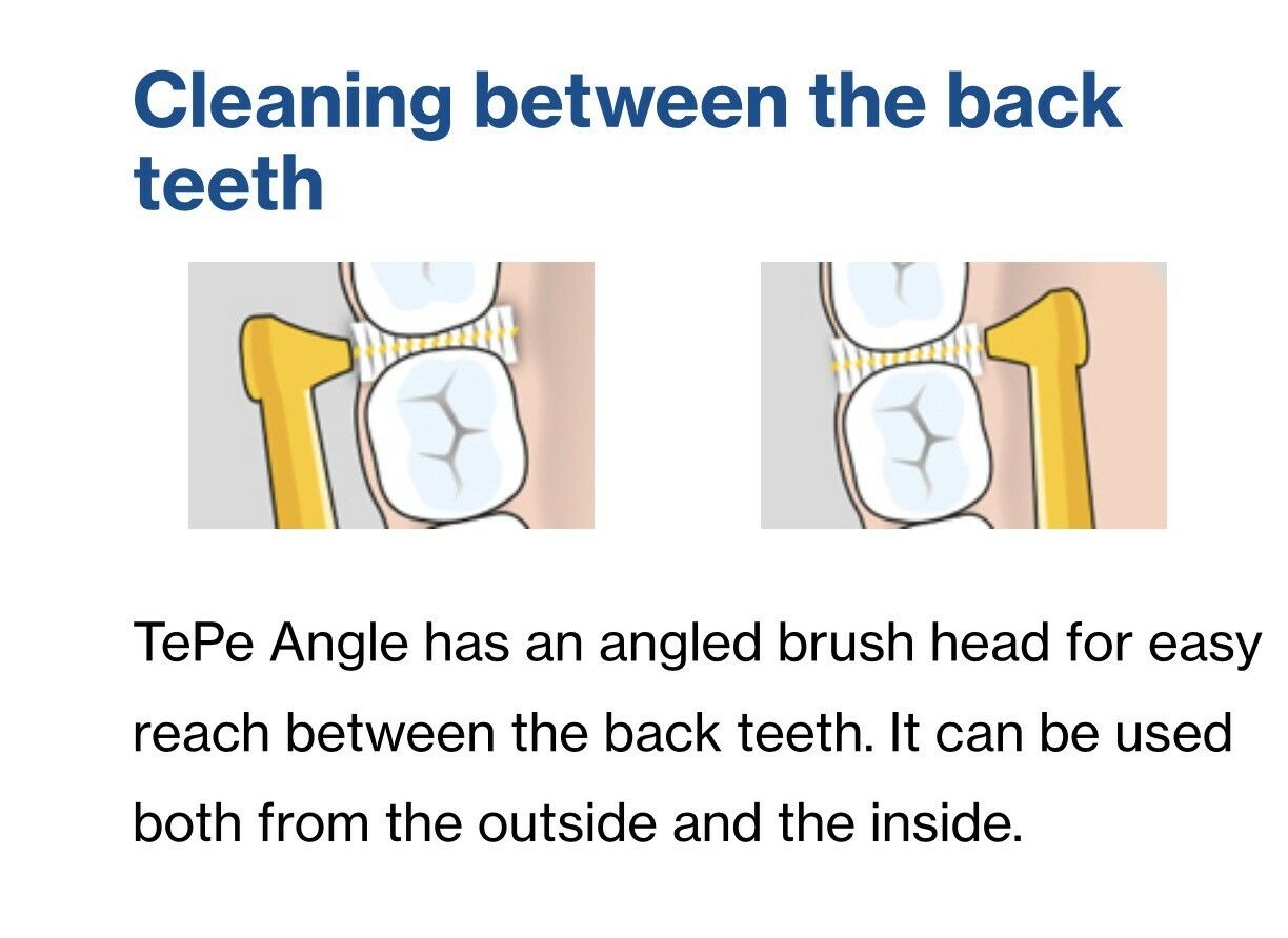 TePe Angle is an interdental brush designed for excellent access to all interdental spaces. It has an angled brush head and a longer handle
